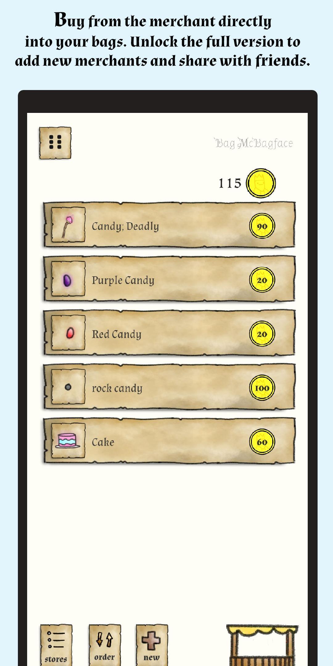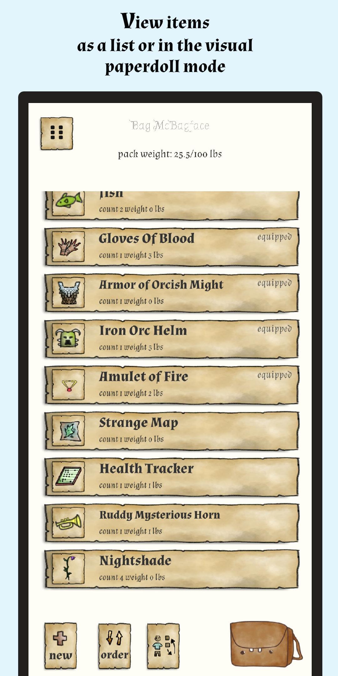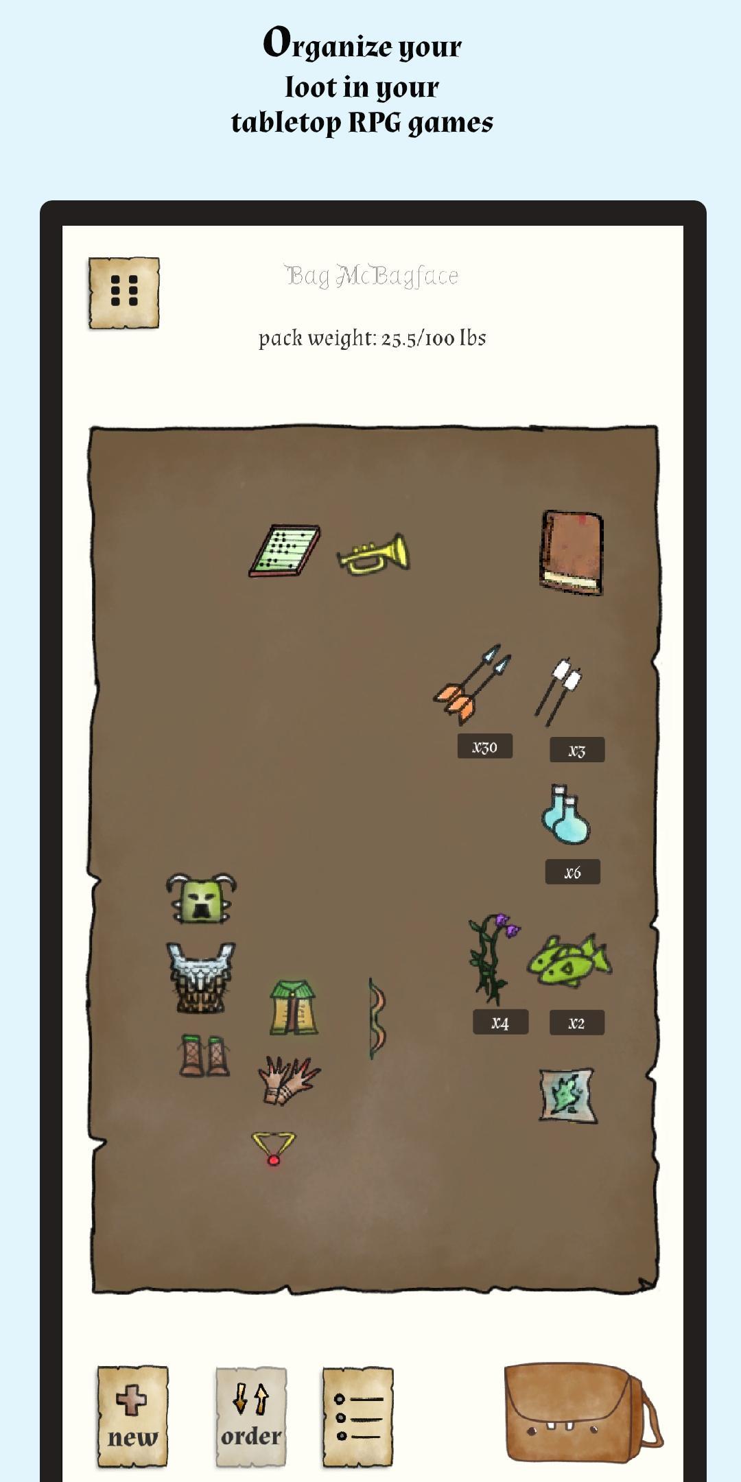 Track gold in the coin purse. Use gold to buy basic gear and magic items. Easily edit and customize your items by adding notes or detailed rules. Track your quests in a journal and add custom items into your inventory. Easily see how much weight you are carrying.