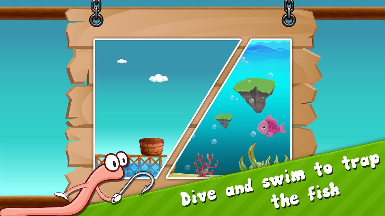 Hooky Worm is an animated all directional play character that traverse settings to find the coins and fish. Success through each level means getting the worm and jumping from a red surf board to a wooden barrel and then unhooking the fish. Each level has a new course of safe and family fun adventure and a new way of fishing.