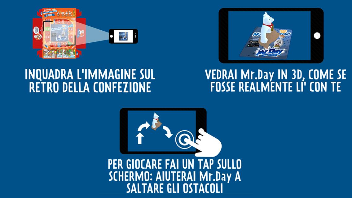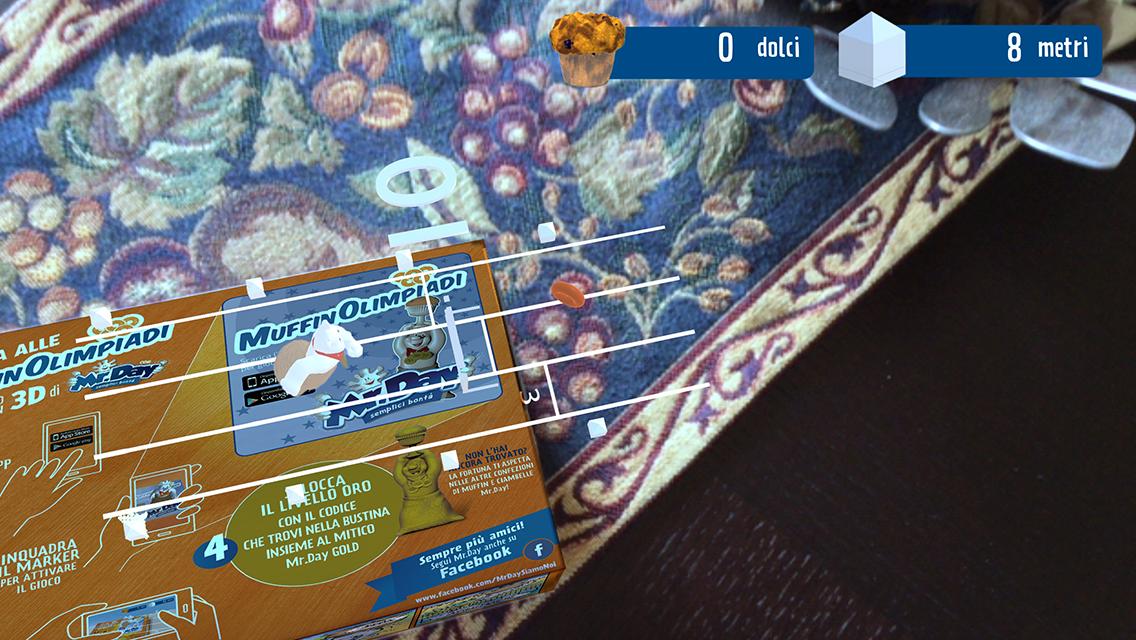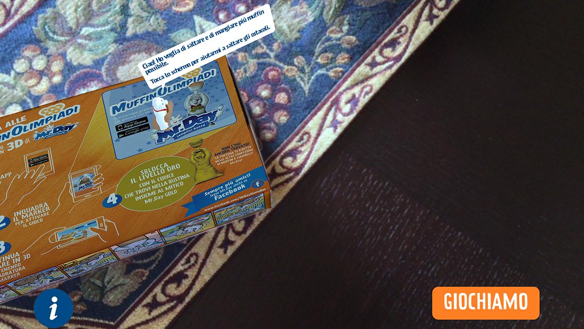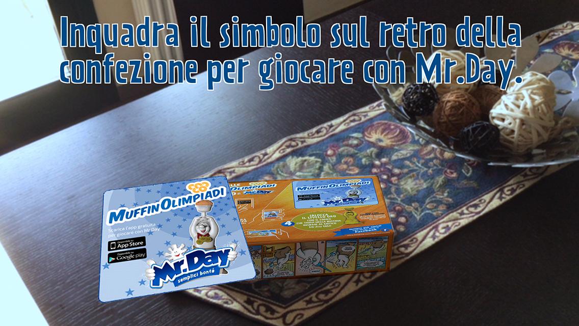 Welcome to the world of MrDay, where the image of the character printed on the back of the packs of the Mr.Day Day snacks becomes an interactive game thanks to the power of augmented reality. He frames the figure and helps MrDay to win the muffinolimpiadi: jump to avoid obstacles and not miss even a muffin.