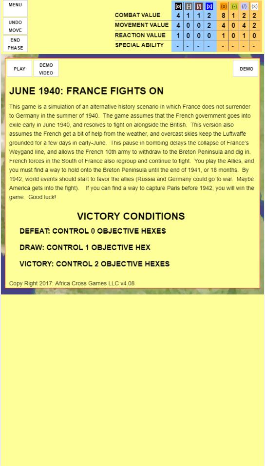 This game is a simulation of an alternative history scenario in which France does not surrender to Germany in the summer of 1940. The game assumes that the French government goes into exile early in June 1940, and resolves to fight on alongside the British. This version also assumes the French get a bit of help from the weather, and overcast skies keep the Luftwaffe grounded for a few days in early-June. This pause in bombing delays the collapse of France’s Weygand line, and allows the French 10th army to withdraw to the Breton Peninsula and dig in. French forces in the South of France also regroup and continue to fight. You play the Allies, and you must find a way to hold onto the Breton Peninsula until the end of 1941, or 18 months. By 1942, world events should start to favor the allies (Russia and Germany could go to war. Maybe America gets into the fight). If you can find a way to capture Paris before 1942, you will win the game.