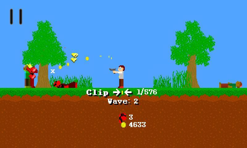 Survive as long as you can against wave after wave of zombies in this retro 8bit styled zombie game! Use simple taps to fire bullets. Tap your character to switch guns. Gain coins by slaying zombies and aliens with a handgun, a revolver, a shotgun, and a machine gun. Head shots do more damage. Spend coins on gun upgrades and new unlock-able guns like the flamethrower!