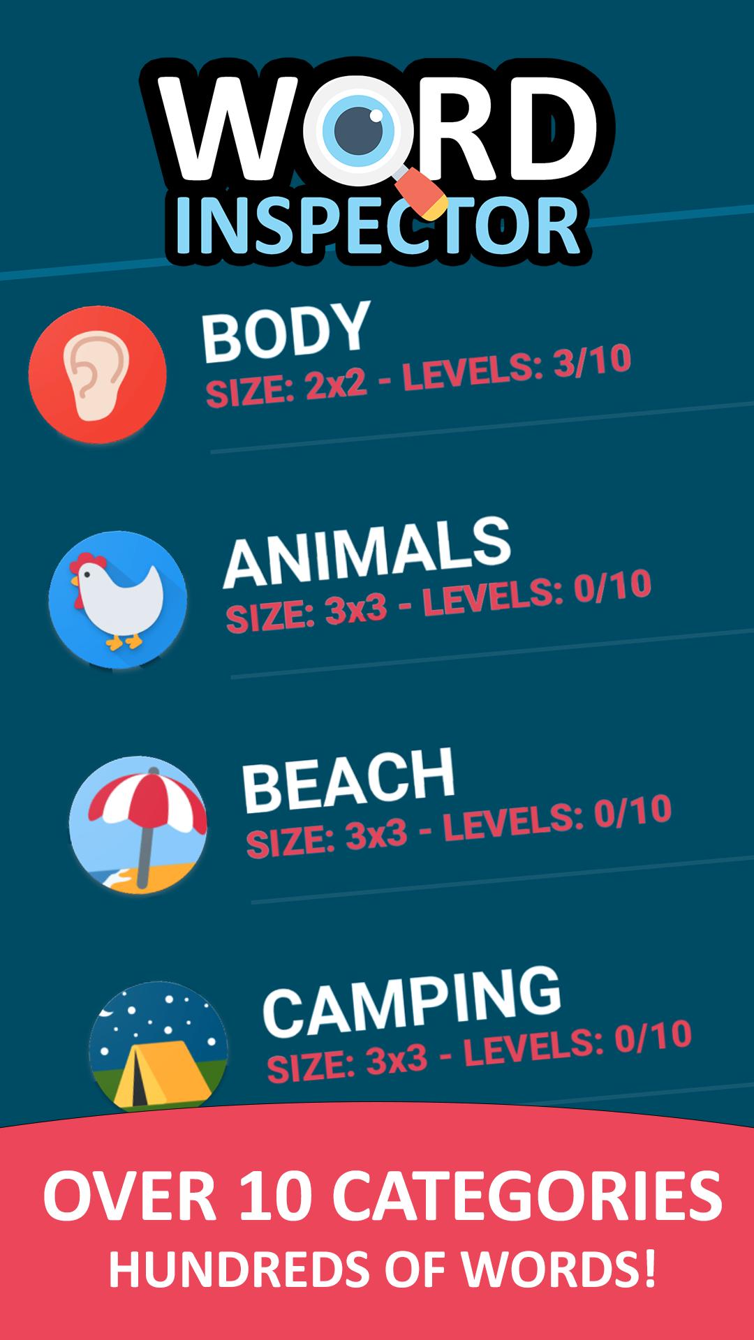 Become a true inspector and find the hidden words in this game, you are the inspector and it is up to you to find all the words, there's different categories and all of them are solvable and very fun to play. The difficulty on each category increases as you play. You can also learn and expand your vocabulary by playing!