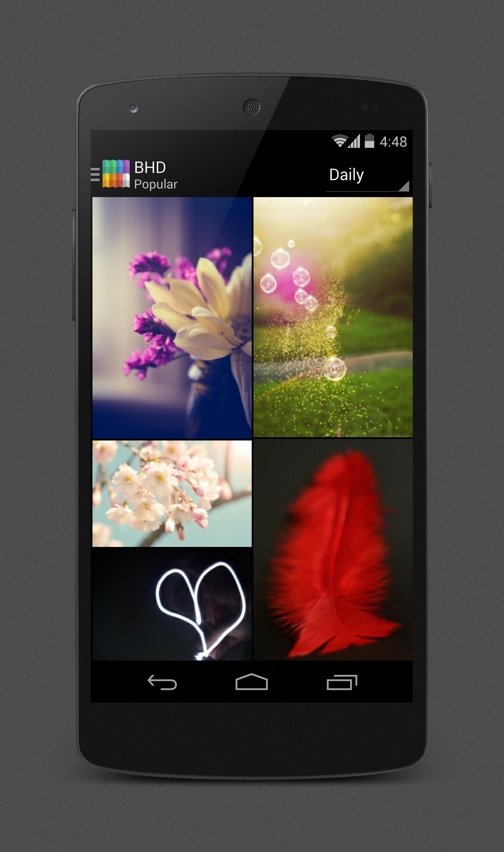 BHD adalah aplikasi gratis untuk digunakan yang dirancang khusus untuk memungkinkan pengguna Android mempersonalisasikan perangkat mereka dengan berbagai wallpaper berkualitas tinggi dan unik. Ngomong -ngomong, Bhd adalah singkatan dari latar belakang HD .