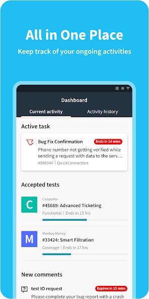 Fokus kami adalah melakukan pengujian saat bepergian semudah mungkin. Kami menawarkan gambaran umum dari semua proyek dan tugas yang tersedia, formulir pengiriman intuitif dengan petunjuk AI pintar, dan pengingat tugas dan permintaan yang sedang berlangsung - semua untuk mendukung Anda dalam perjalanan pengujian Anda.