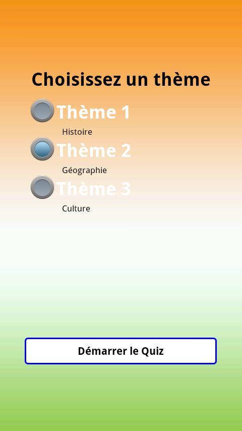 Dengan aplikasi sepenuhnya gratis ini dan dalam bentuk kuis di antarmuka yang sangat intuitif, uji pengetahuan Anda tentang Pantai Gading negara yang indah ini. Pilih tema dan mulai, tujuannya adalah untuk memiliki skor terbesar pada serangkaian 20 pertanyaan berdasarkan kuis dan meningkatkan pengetahuan Anda yang diubah untuk beberapa orang, dari kelas kelas menengah