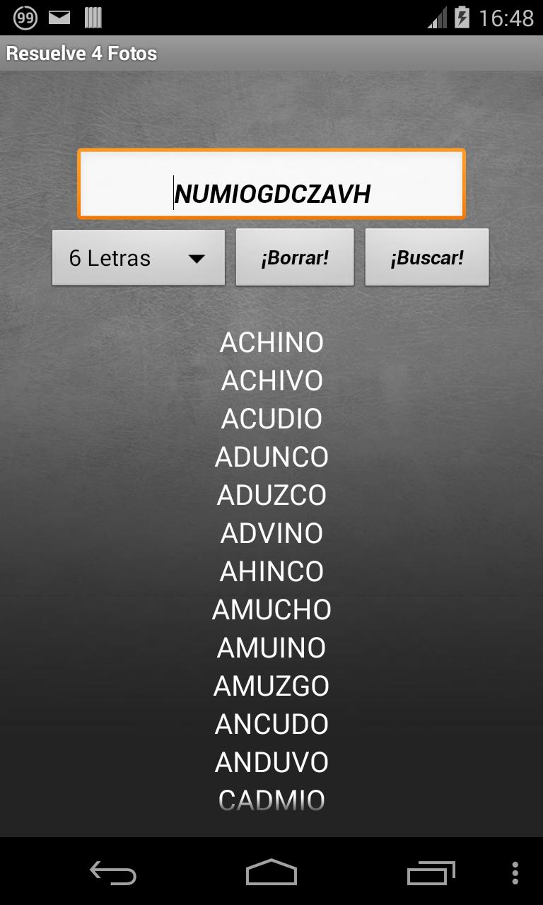 Di sini Anda hanya perlu memperkenalkan huruf yang Anda miliki dan Anda akan memiliki daftar solusi yang mungkin, secara transparan, sehingga Anda dapat memvisualisasikan jika ada yang benar.