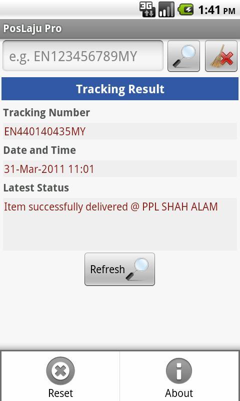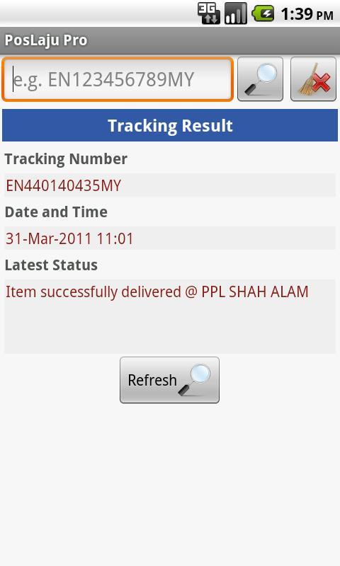 小包追跡番号を入力フィールドに入力し、「検索」アイコンをタップすると、 PosLaju Malaysia Serverから小包のステータスが直接取得されます。