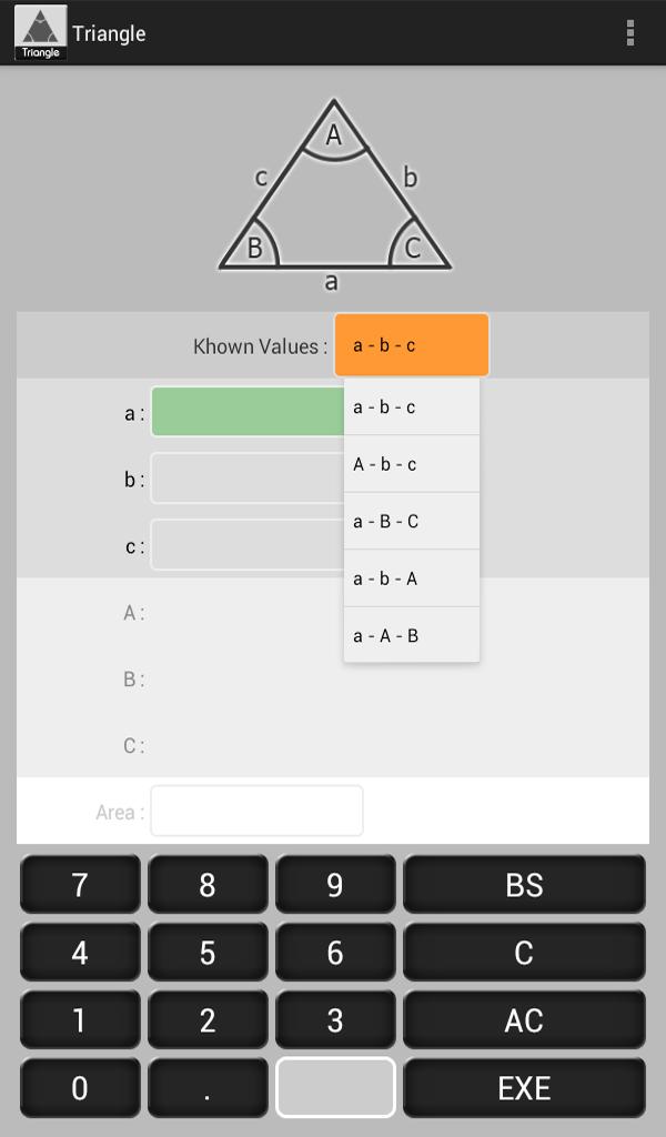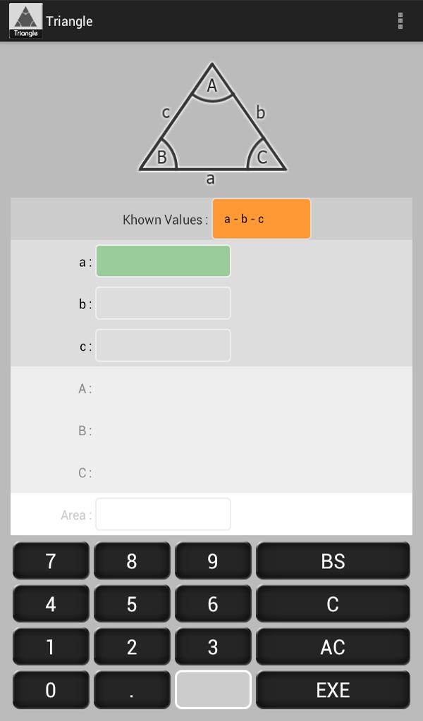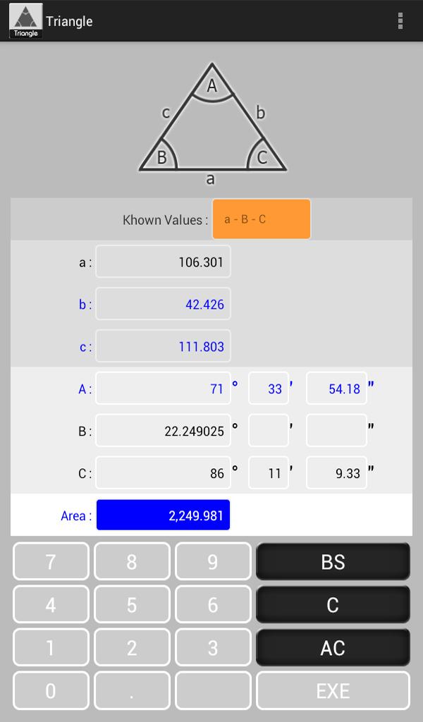 このアプリケーションは、の角度A、B、Cの辺A、B、C、およびの領域を計算するために使用されます