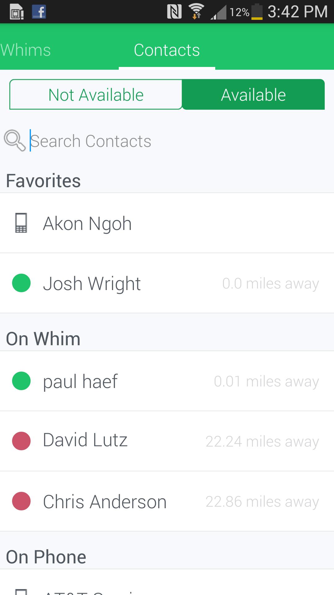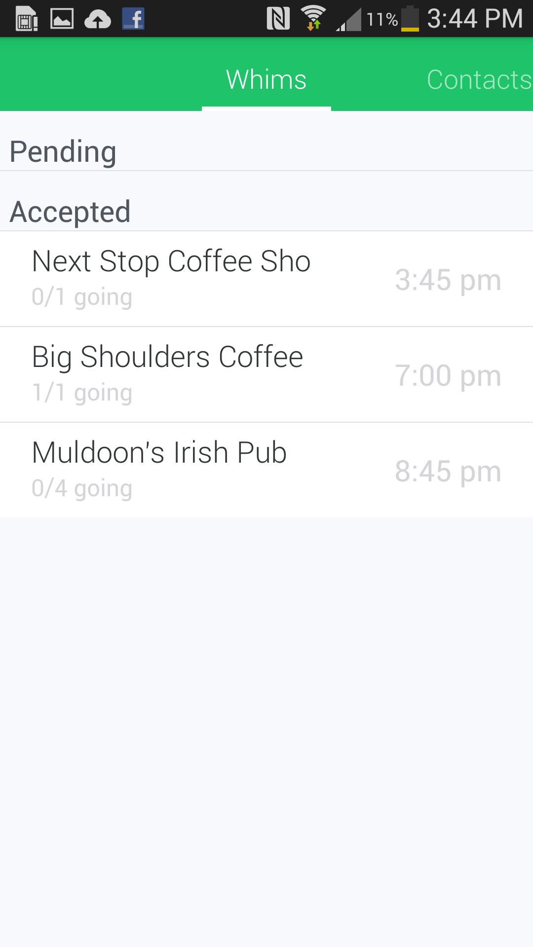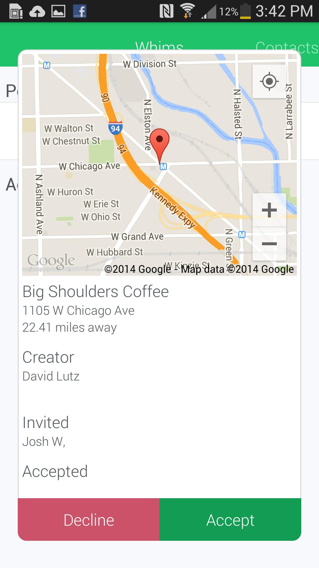 最近は誰もが忙しく、私たち全員が異なるスケジュールを持っています。 Whimを使用して、衝動で友達と会ってください。地元のレストラン、コーヒーショップなどのWhim Sに連絡先を招待してください!