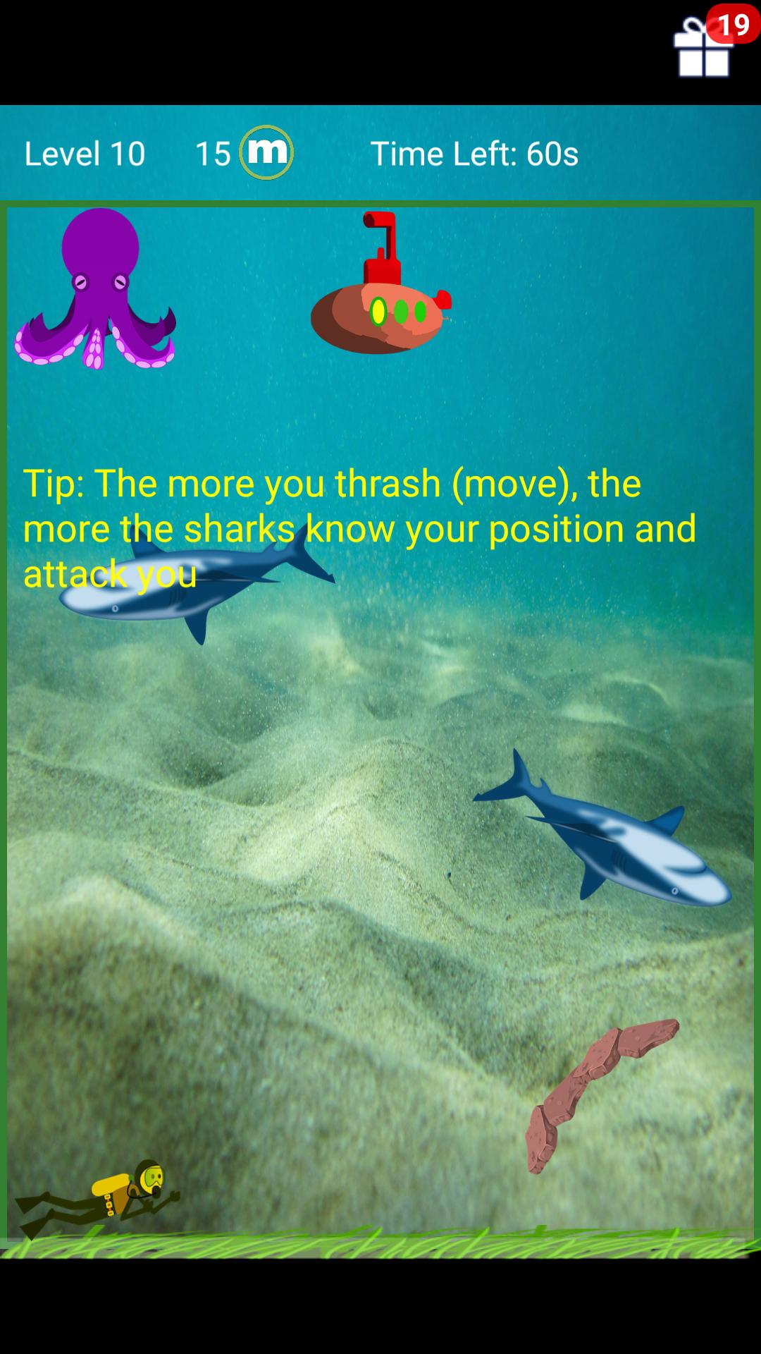 あなたは探検している深海のダイバーです、まあ...深海...そして突然、あなたはあなたがあなたのタンクに60秒しか残っていないことに気付きました。あなたはあなたの潜水艦に目を向け、それに向かって道を作り始めます。しかし、あなたが見る問題は1つしかありません。あなたは海を探索して幸せでしたが、一部の魚は近くの地域に来て、今では潜水艦への道をブロックしています。そして、ああ、これらの魚はそうでなければサメと呼ばれます!!これで、空腹のサメを避けながら、60秒以内にサブに到達しなければなりません。