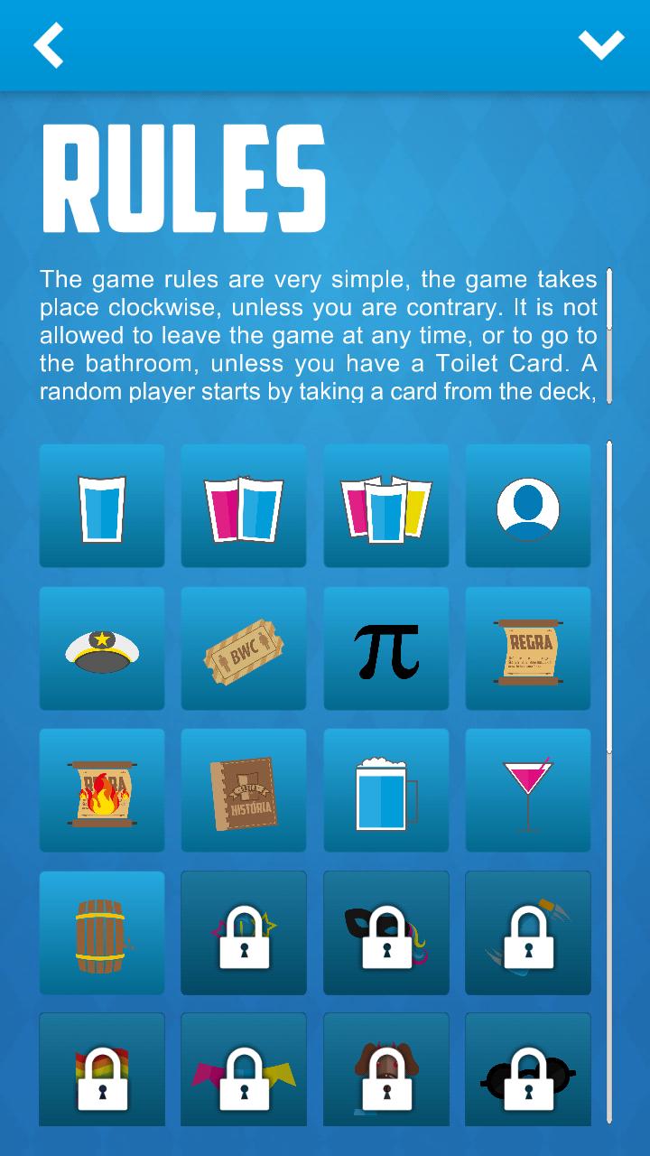 ゲームのルールは非常に簡単で、ゲームは反対でない限り時計回りに行われます。手紙のバスルームがない限り、いつでもゲームを離れることも、バスルームに行くことも許可されていません。ランダムなプレーヤーは、デッキからカードを取得することから始めます。各カードには意味があり、異なるアクションがあり、合計は13枚のカードで、基本的なデッキを形成します。また、基本的なカードやその他の店で購入した他のカードを使用して、独自のデッキをカスタマイズすることもできます。カードの周りでは、プレイヤーはそれに書かれたアクションを満たす必要があります。撤退の場合、ボタンを押す必要があり、罰を満たす必要があります。