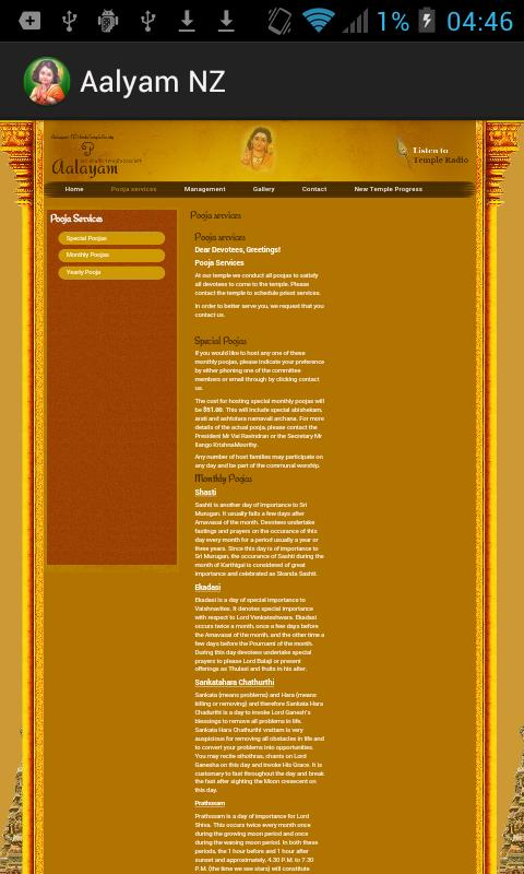 Poojas especiais são realizadas em todos os Sankatahara Chathurthi, Sasti, Prathosam. Se você deseja sediar qualquer um desses poojas mensais especiais, indique sua preferência telefonando para o presidente Sr. Vai Ravindran no número 09-6278008, além do Temple Pooja e Aarathani, fazemos o serviço comunitário sob o nome Aalayam Community Service. Algumas das atividades são: