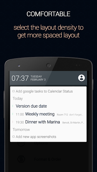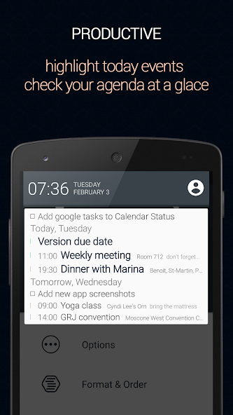 Calendar Status coloca sua agenda na sua gaveta de notificação, fornecendo acesso fácil e rápido à sua agenda de qualquer aplicativo e qualquer tela.
