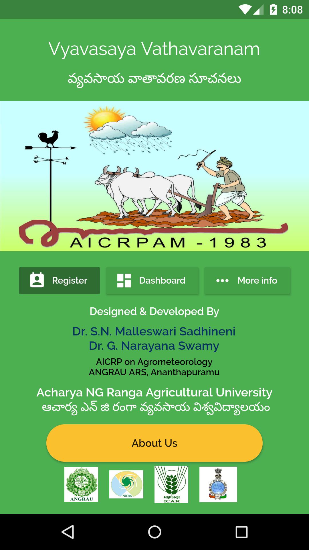 “Vyavasaaya Vathavaranam” é a aplicação agrometeorológica orientada para agricultores, que fornece informações sobre clima, previsão do clima de média alcance, avisos da Agromet, alertas, arquivamentos de dados climáticos para todos os 13 distritos de Andhra Pradesh, Índia.
