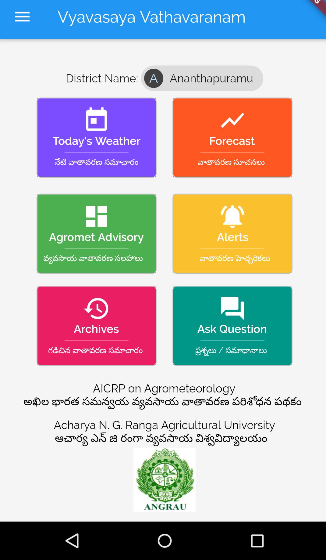 Este aplicativo foi projetado e desenvolvido pela AICRP sobre agrometeorologia, ARS, Ananthapuramu, Acharya Ng Ranga Agricultural University para uma disseminação mais rápida das previsões climáticas e avisos de agromet para os agricultores de Andhra Pradesh. As informações fornecidas neste aplicativo são úteis para os agricultores de Andhra Pradesh no planejamento oportuno de várias operações em culturas agrícolas e hortícolas e criação de animais. As informações estão disponíveis nos idiomas Telugu e Inglês.