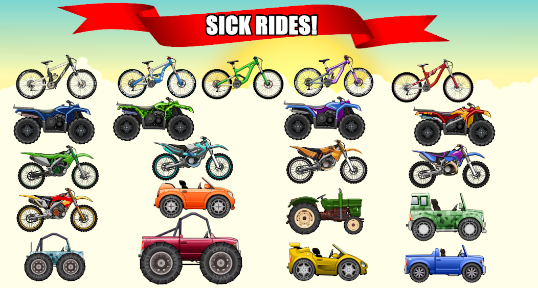 Os veículos incluem: bicicletas de montanha, BMX, quadriciclos, bicicletas de motocross, jipe, carro de corrida, caminhões de monstros, Tractor e muito mais!
