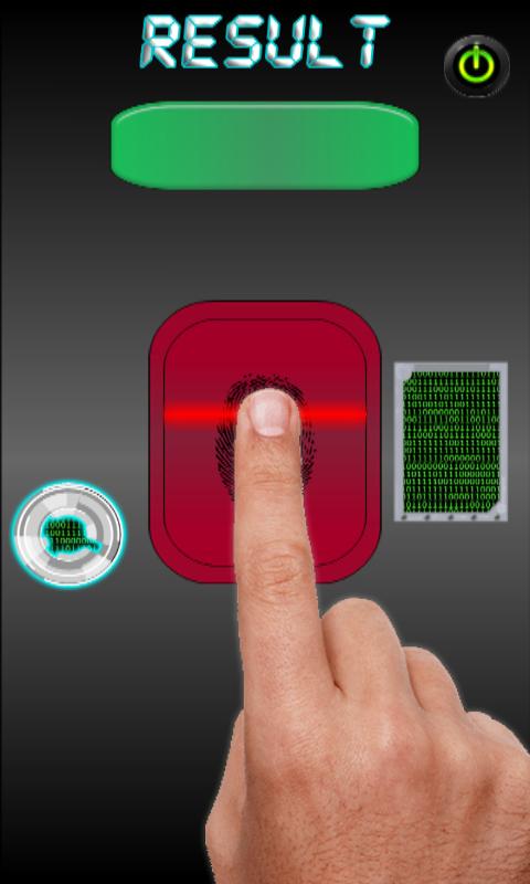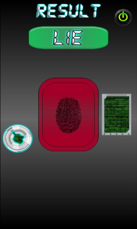 Quando a varredura simulada começar, um raio escaneia a impressão digital de seus amigos. Animações agradáveis personalizadas ajudam a ser uma ótima brincadeira. Primeiro - coloque o dedo no painel do scanner e espere enquanto um laser examina sua impressão digital e, quando a análise estiver concluída, o detector fornecerá uma resposta ao seu amigo se estiver dizendo uma verdade ou eles estão mentindo.