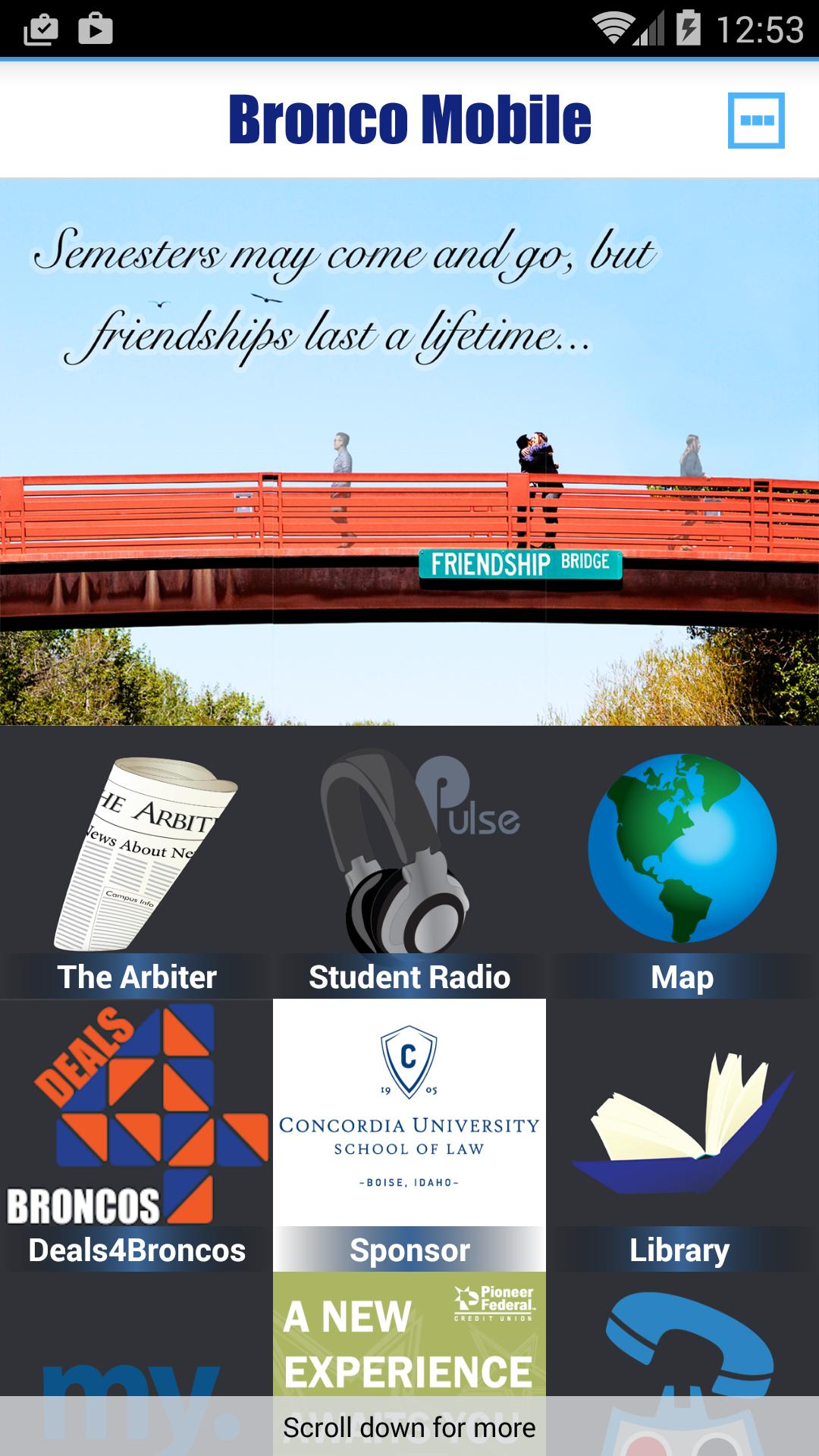 Bronco Mobile предоставляет вам все, от карты кампуса, полного каталога кампуса веб -сайтов департаментов и номеров телефонов, прямой трансляции студенческого радио Pulse, последних новостей, мероприятий и Bronco Sports.