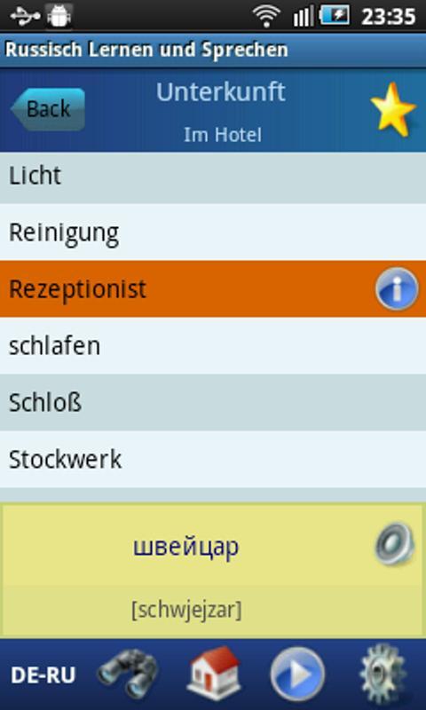 Das Programm ist auch zuverlässig als der elektronische sprechende Übersetzer während der Auslandsreisen. Es erlaubt dir, sich leicht in allen typischen Situationen - im Restaurant, bei der Bank, im Hotel, auf dem Flughafen... zu verständigen. Вы можете купить билет на кассу без проблем, отказавшись от заказа в ресторане, вы просите об этом или записываете встречу на встречу.