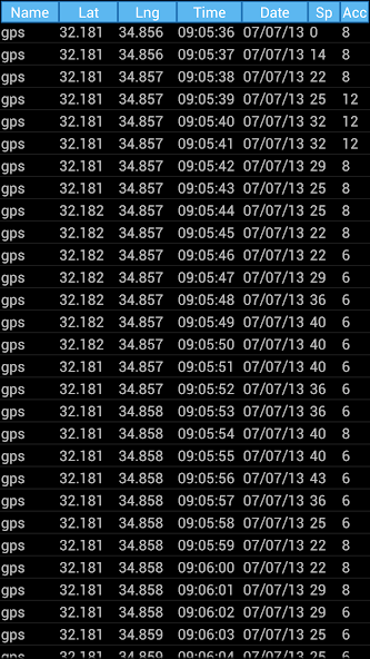 Широта, долгота, точность, время, дата, скорость км/ч.