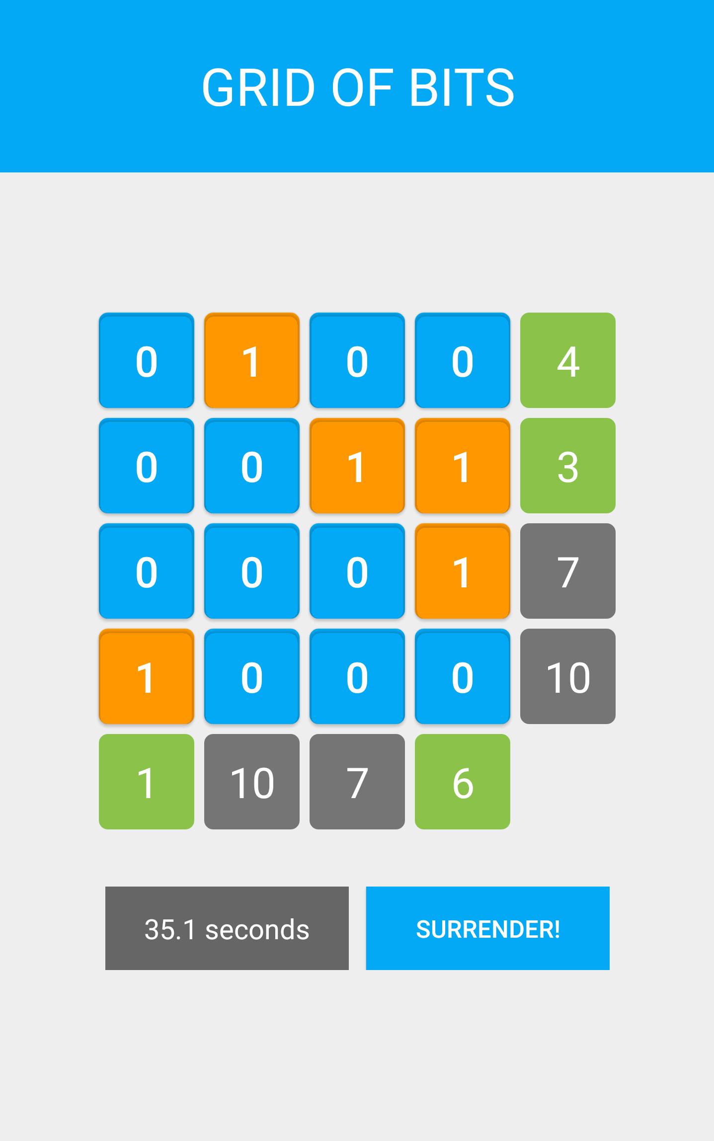 Grid of Bits is a game where you can toggle the bits found in each cell of the grid. Find the correct binary representation of the decimal numbers found at the end of each row and column to win the game!