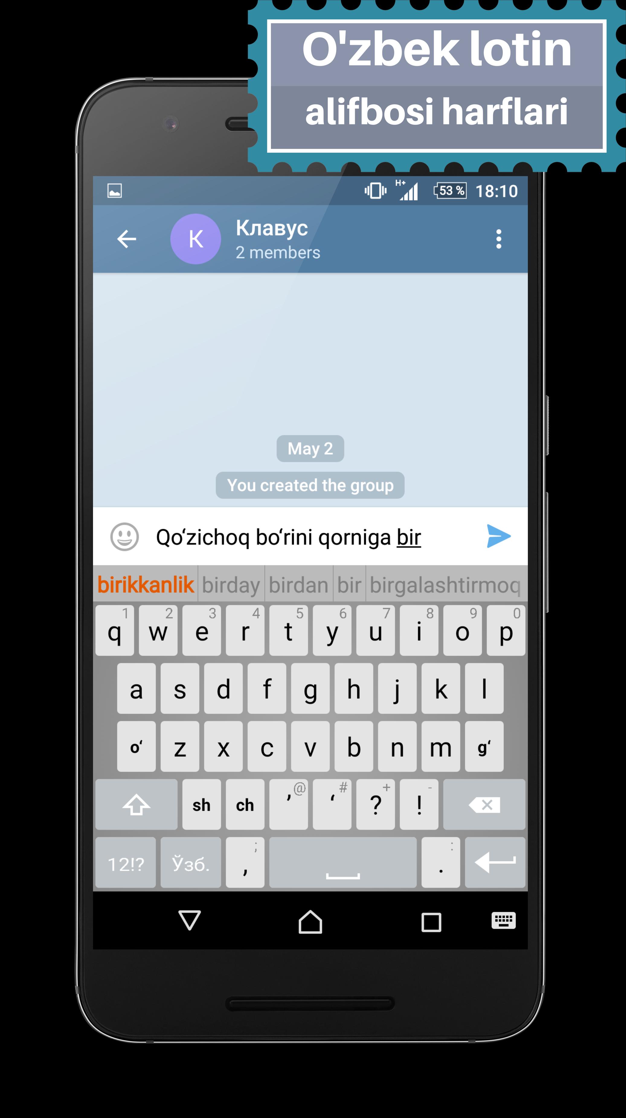 "แอปพลิเคชั่นมือถือที่ชื่นชอบใน Uzbek และ Cyrillic Alphabets ใน Uzbek รวมถึงตัวอักษรของคำในภาษาอุซเบกนอกจากนี้ยังสามารถรวมคำใหม่ที่ด้านล่างของคีย์นี่เป็นบทสนทนาเต็มเวลา" โซเวียตคุณจากความยากลำบาก หากคุณไม่ต้องการแสดงความรู้สึกเป็นคำพูด "รอยยิ้ม" มาช่วย -