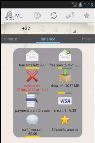 แอปพลิเคชันเพื่อดูข้อมูล Mobile Vikings ล่าสุดของคุณ ข้อมูลนี้รวมถึง: