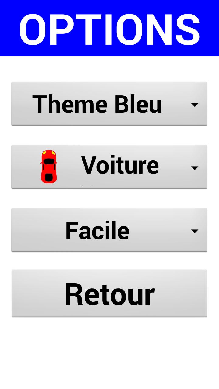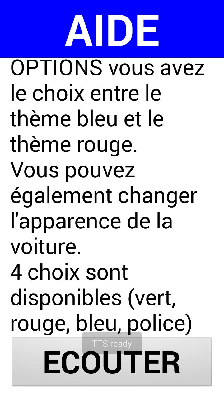 คุณสามารถเปลี่ยนรูปลักษณ์ของรถเปลี่ยนสีของธีมของเกมเปิดใช้งานหรือไม่เพิ่มขึ้นเมื่อรองรับหน้าจอและหรือไม่เปิดใช้งานคำแนะนำเสียง ทุกอย่างเกิดขึ้นในเมนูตัวเลือก เมนูช่วยเหลือสามารถอ่านออกเสียงได้โดยการกด "ฟัง"