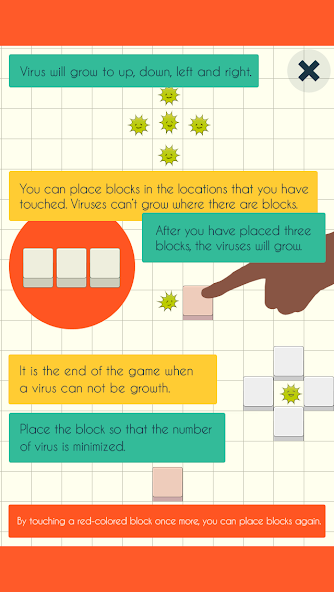 คุณสามารถวางบล็อกในสถานที่ที่คุณได้สัมผัส ไวรัสไม่สามารถเติบโตได้ในที่ที่มีบล็อก หลังจากที่คุณวางสามช่วงตึกไวรัสจะเติบโต มันเป็นจุดสิ้นสุดของเกมเมื่อไวรัสไม่สามารถเติบโตได้ วางบล็อกเพื่อให้จำนวนไวรัสลดลง