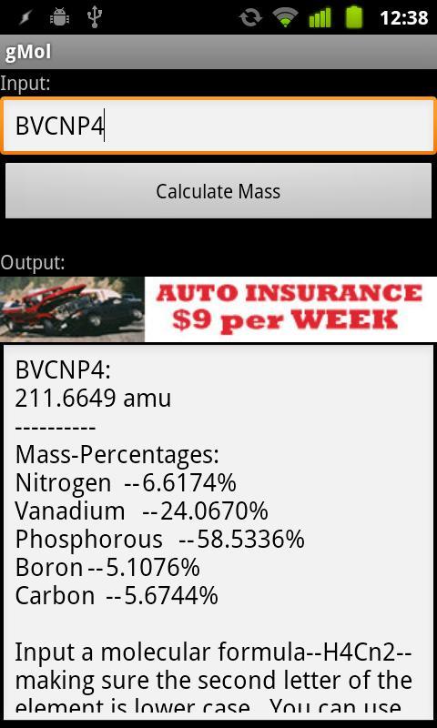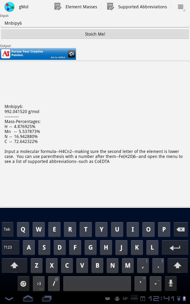 循环桌和铅笔的绝佳替代方法。 GMOL将计算摩尔质量(原子质量)和元素质量百分比,从打字的化学式计算。方便在高中,美联社,大学或大学化学,生物学或(甚至可能)物理课程或研究的化学计量学方面。希望您发现它有用!