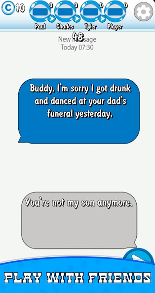幽默的游戏新手机将这四个玩家团结起来,他们从一定数字中收到有趣的消息,他们需要在60秒内选择对此消息的有趣回复。所有玩家选择答案后,每个玩家都会看到其他玩家的答案,并为最有趣的答案投票。因此,事实证明这是一个非常有趣的游戏,您不仅可以单独输入,而且可以与朋友在线玩。