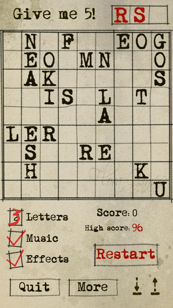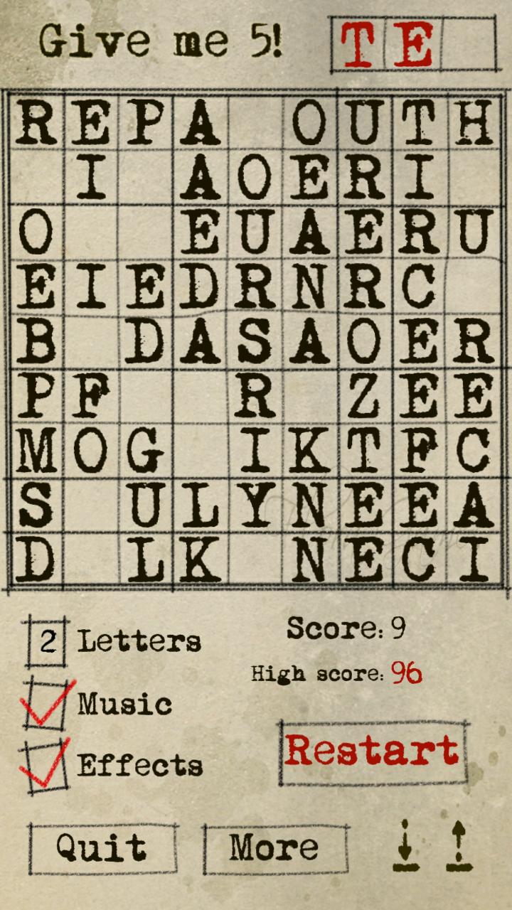 目的是将随机生成的字母连接到五个字母单词(没有名称和专有名词)中。