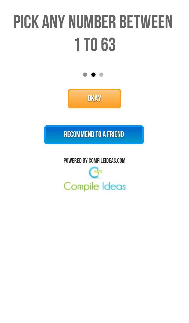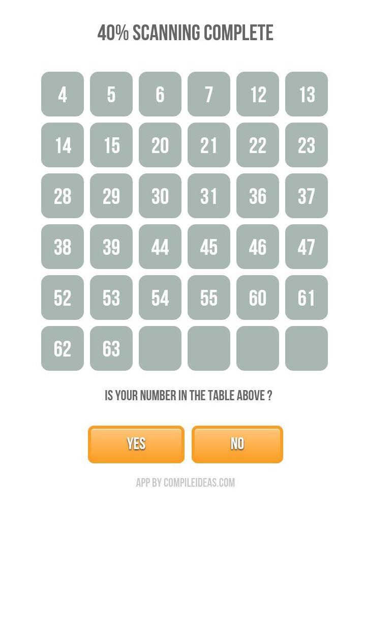 您会想到1到63之间的数字。应用将向您显示6张幻灯片。如果您的号码在幻灯片上,请单击“是”。否则,请单击N。最后,它将猜测您的电话号码。