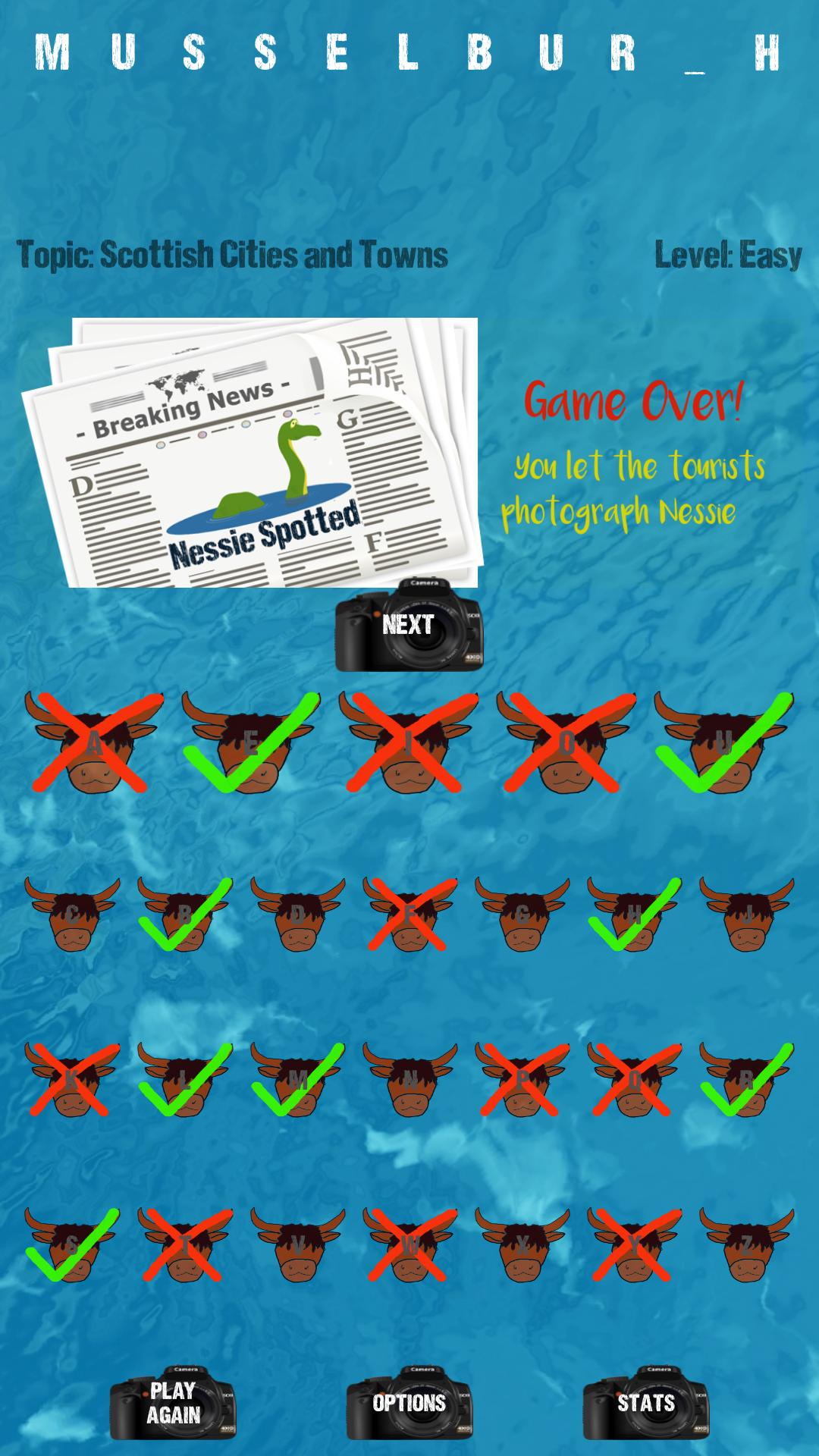 您需要阻止游客为纸张拍摄Nessie的照片,而不是传统的吊手图形!猜猜让Nessie逃脱的单词。