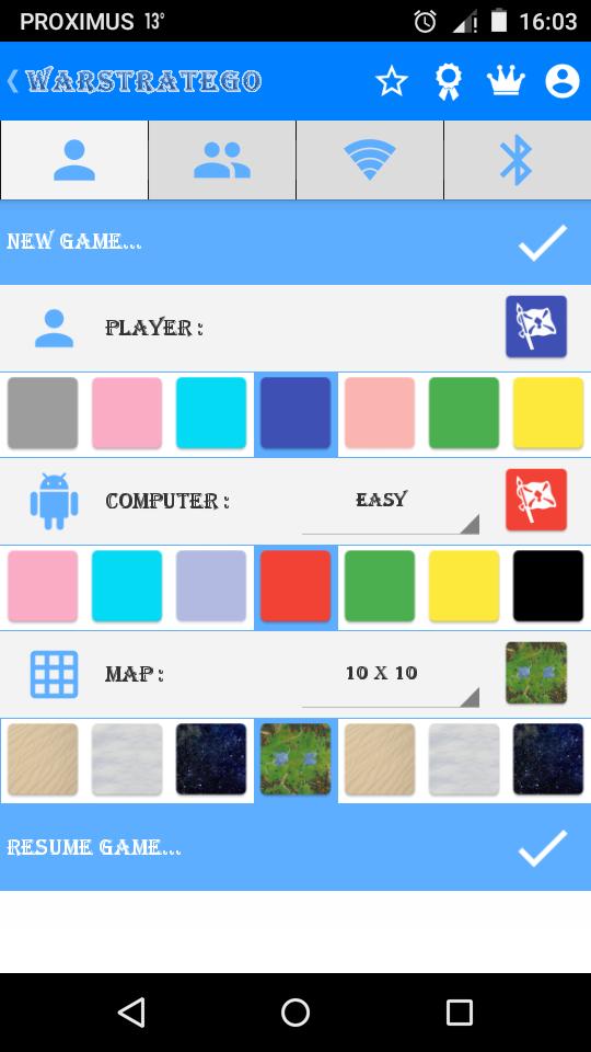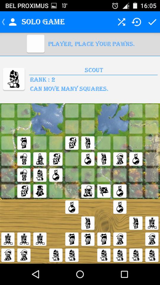 WarStratego是一款策略游戏,例如众所周知的BoardGame“ Stratego”。这是一个基于回合的游戏,您可以一一移动典当。游戏的目的是捕捉ennemy的旗帜。在独奏模式下获得训练与两个不同的IA,或者通过多模式的“通行证和播放”,WiFi(Beta)的多模式或Bluetooth(beta)的多模式来挑战您的朋友!