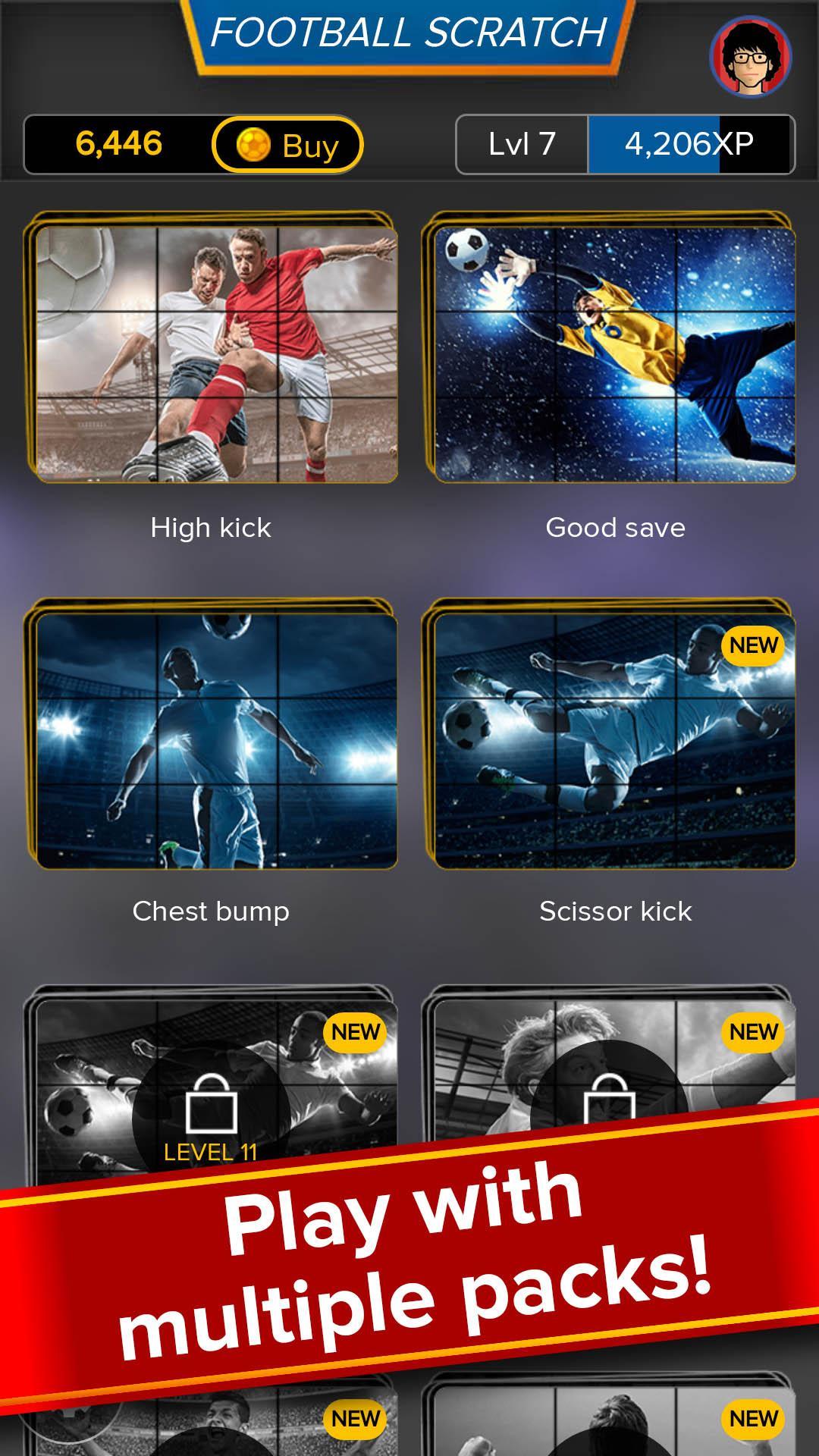 有趣且易於玩的刮擦遊戲,足球迷的划痕卡並贏得硬幣!