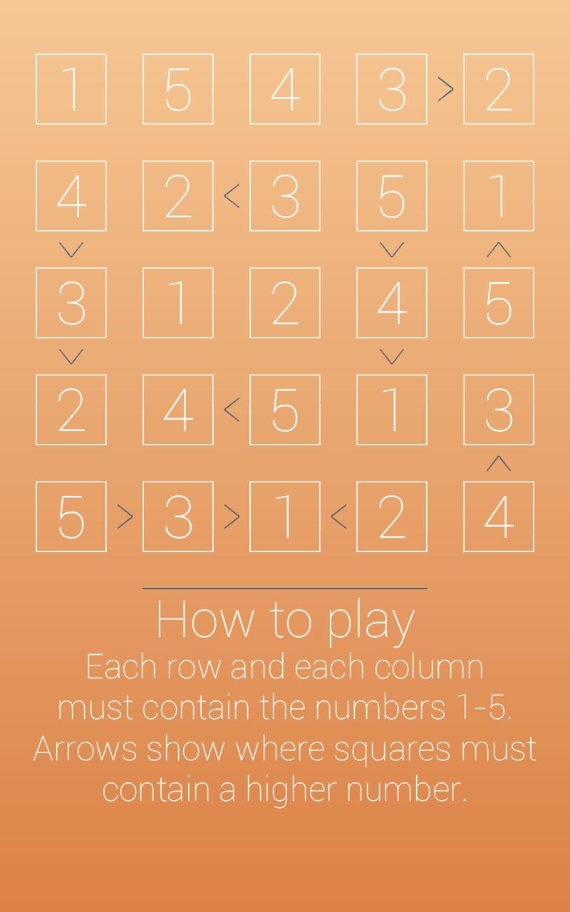您可能也知道這款遊戲是Hutosiki,或多或少。 Futoshiki難題在《時報》,《衛報》和《每日電訊報》上發表。