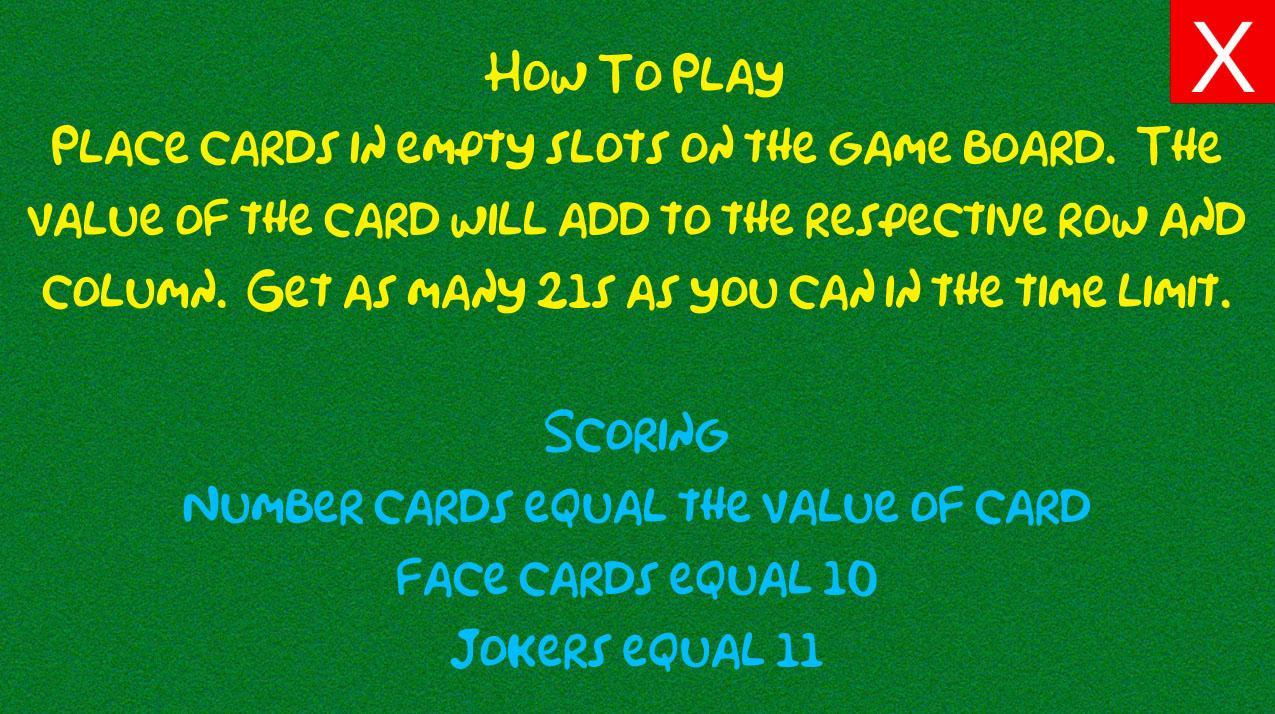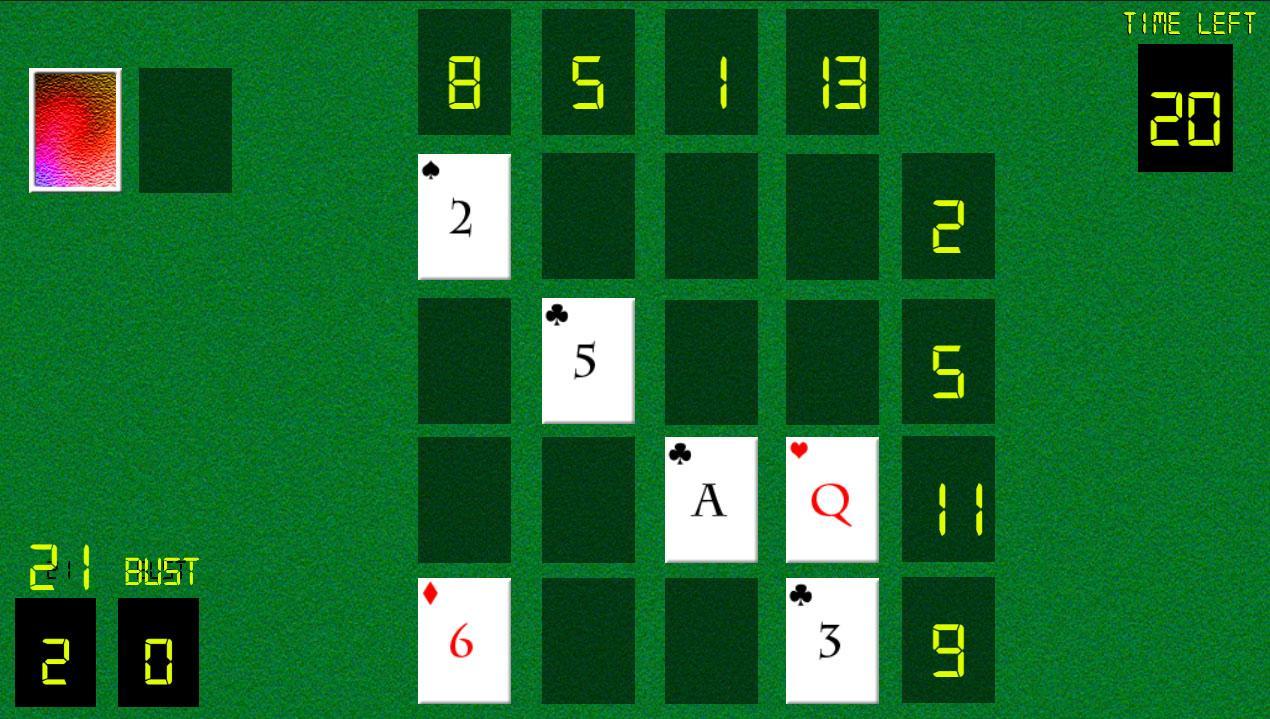 完全按照聽起來的遊戲。使用一張卡片,您會得到一張隨機卡,必須將其放入總計21的列或行中。在計時器用完之前,您可以獲得21次?如果您喜歡紙牌遊戲,那麼這就是您的遊戲!