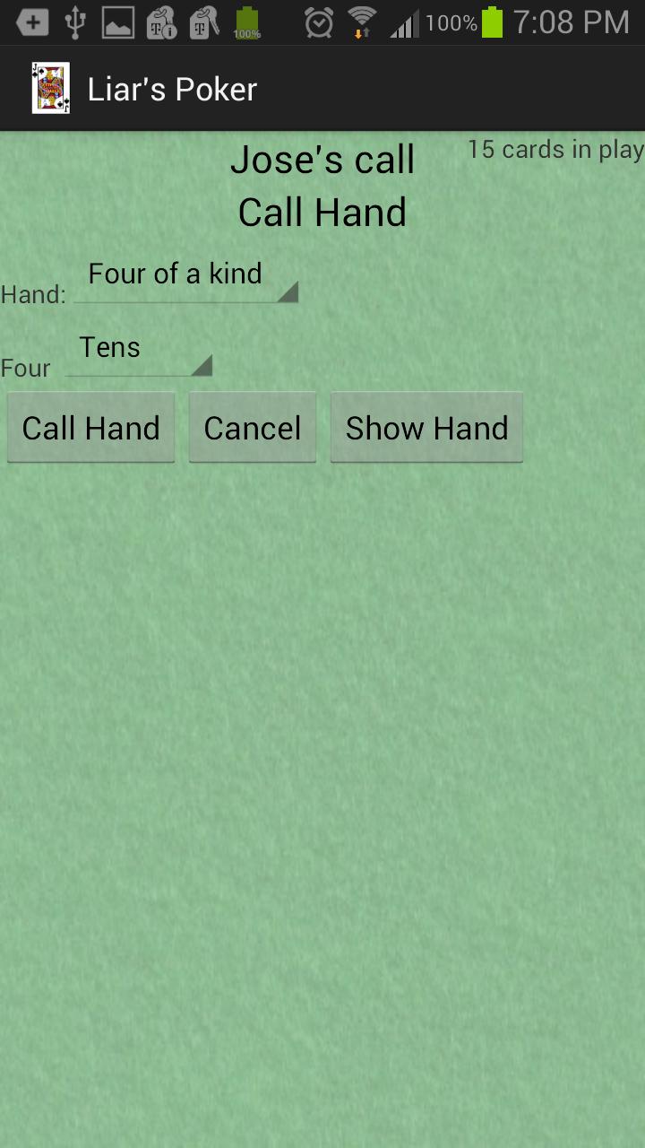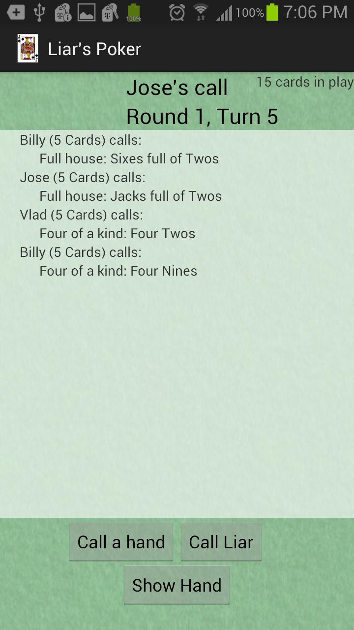 在每輪比賽的開始時,玩家將被釋放一張卡片。任何被銷售的卡都被考慮在玩遊戲中,可用於形成撲克手。當叫撒謊時,所有卡片都會透露出來,如果被稱為紙牌中的手存在,則稱為騙子的玩家在下一輪中丟失了卡片。相反的情況是,如果手中不存在手中的手,則在再次處理卡時,稱為手的玩家會丟失卡。直到只有一個人手裡拿著卡,那個球員被宣佈為獲勝者。