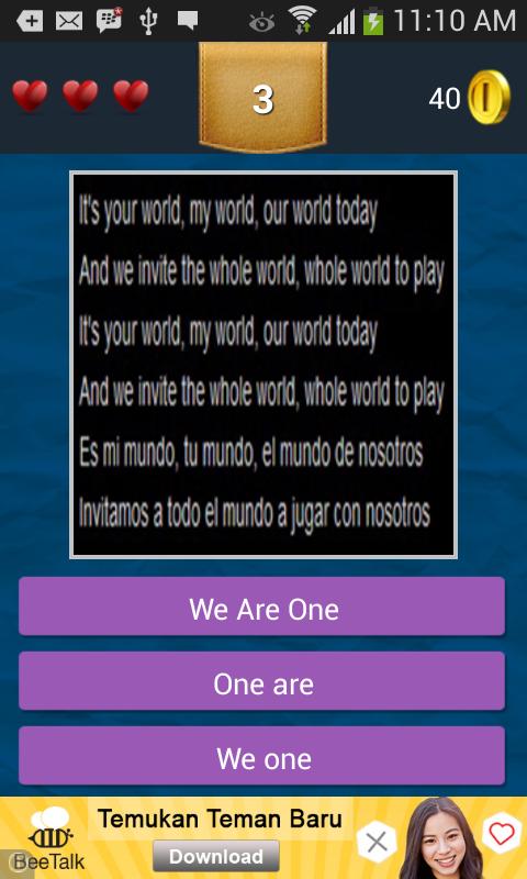Tebak Lagu Terbaru是猜測Tebak Lagu Terbaru遊戲。在此遊戲中,您將提供一首歌歌詞的圖片,然後為您提供3個選項來回答。